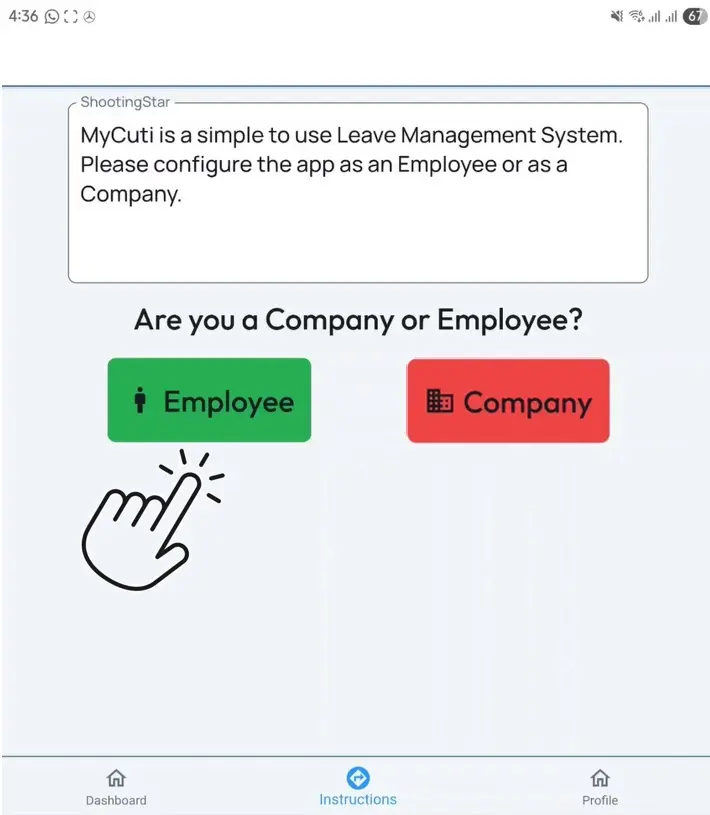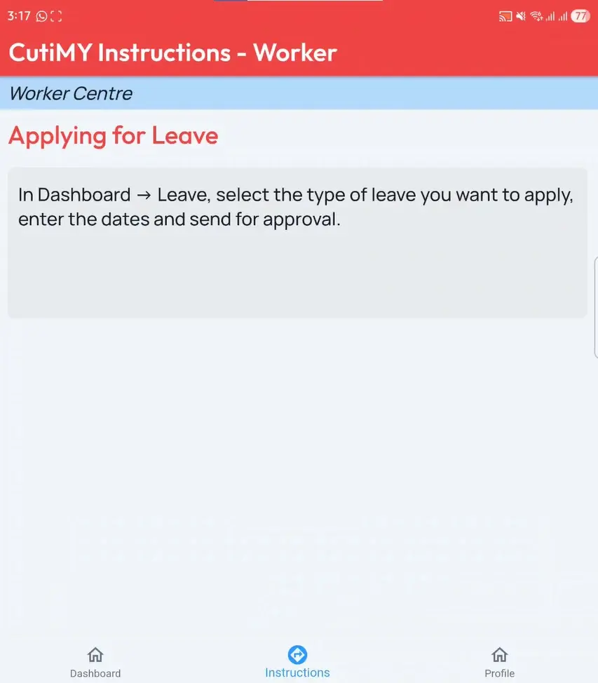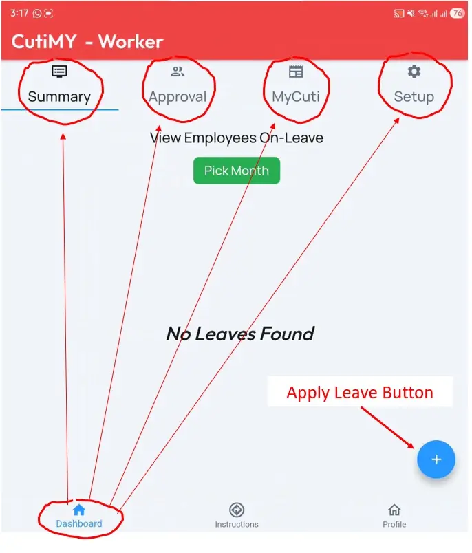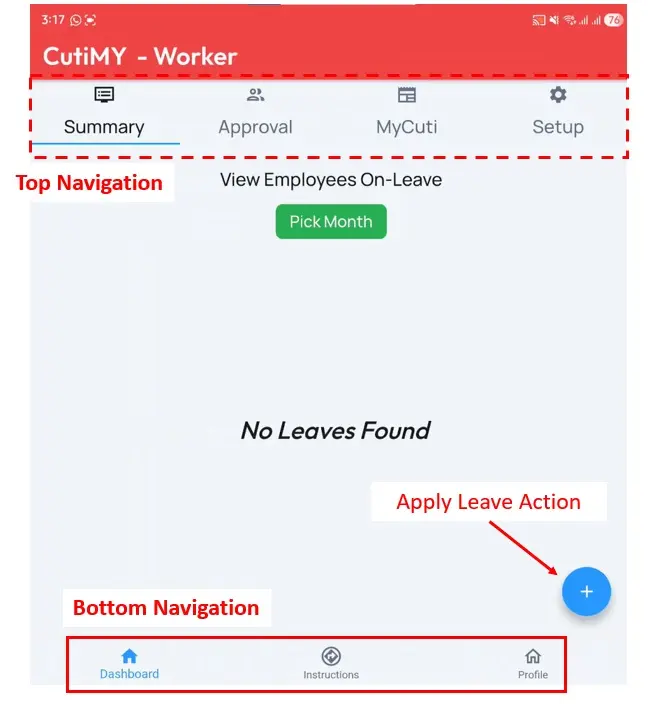 The Dashboard page will allow you to access the top navigation bar and also the Leave Application Action Button.