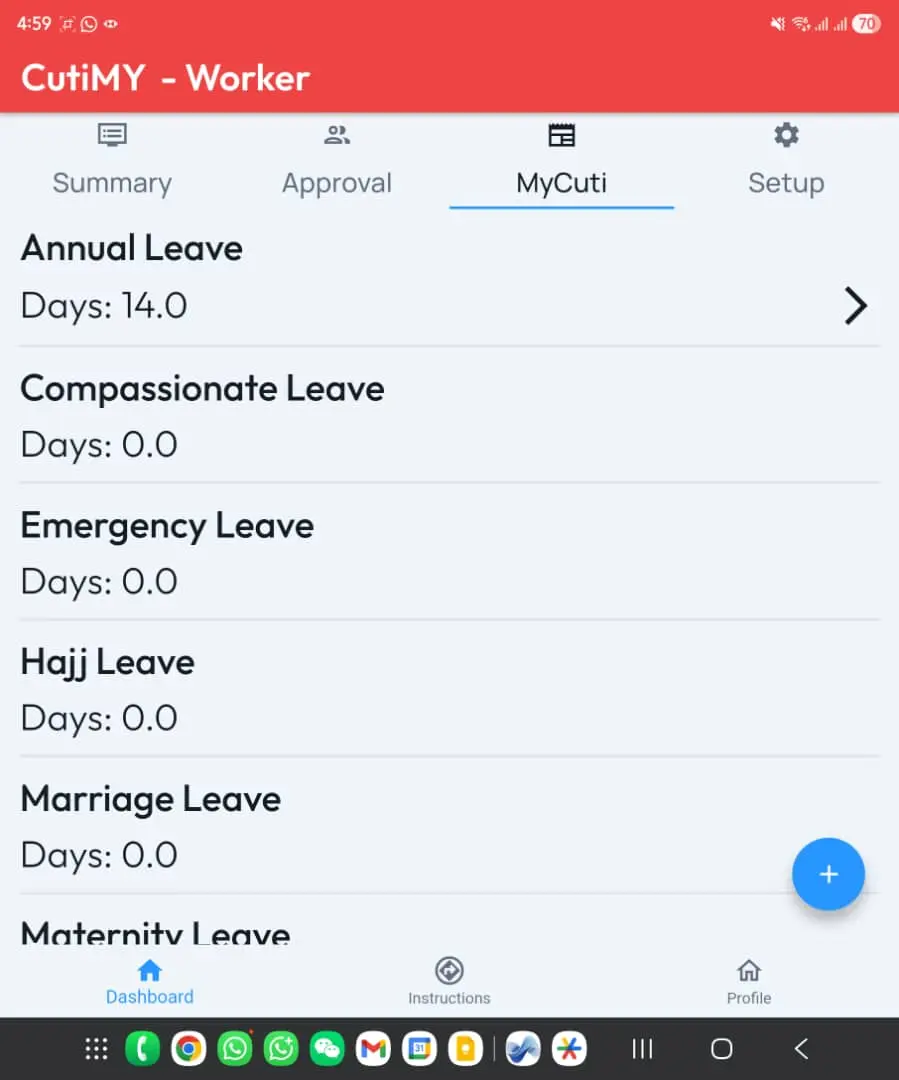 This page shows you the type of leaves you are entitled and allocated by the Company.