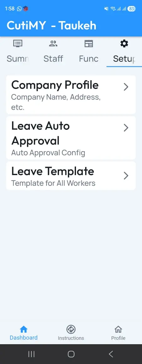 This will bring you (i) view the company profile, (2) Auto Leave Approval and (3) Default Leave Setting Template.